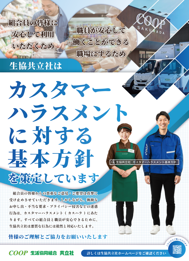 生協共立社は、職員の人権を尊重するために、これらの要求や言動に対し、カスタマーハラスメントに関する基本方針を策定しました。なお、これからも組合員の声に対し真摯に対応し、信頼や期待に応えること、組合員の暮らしに貢献することを心がけてまいります。