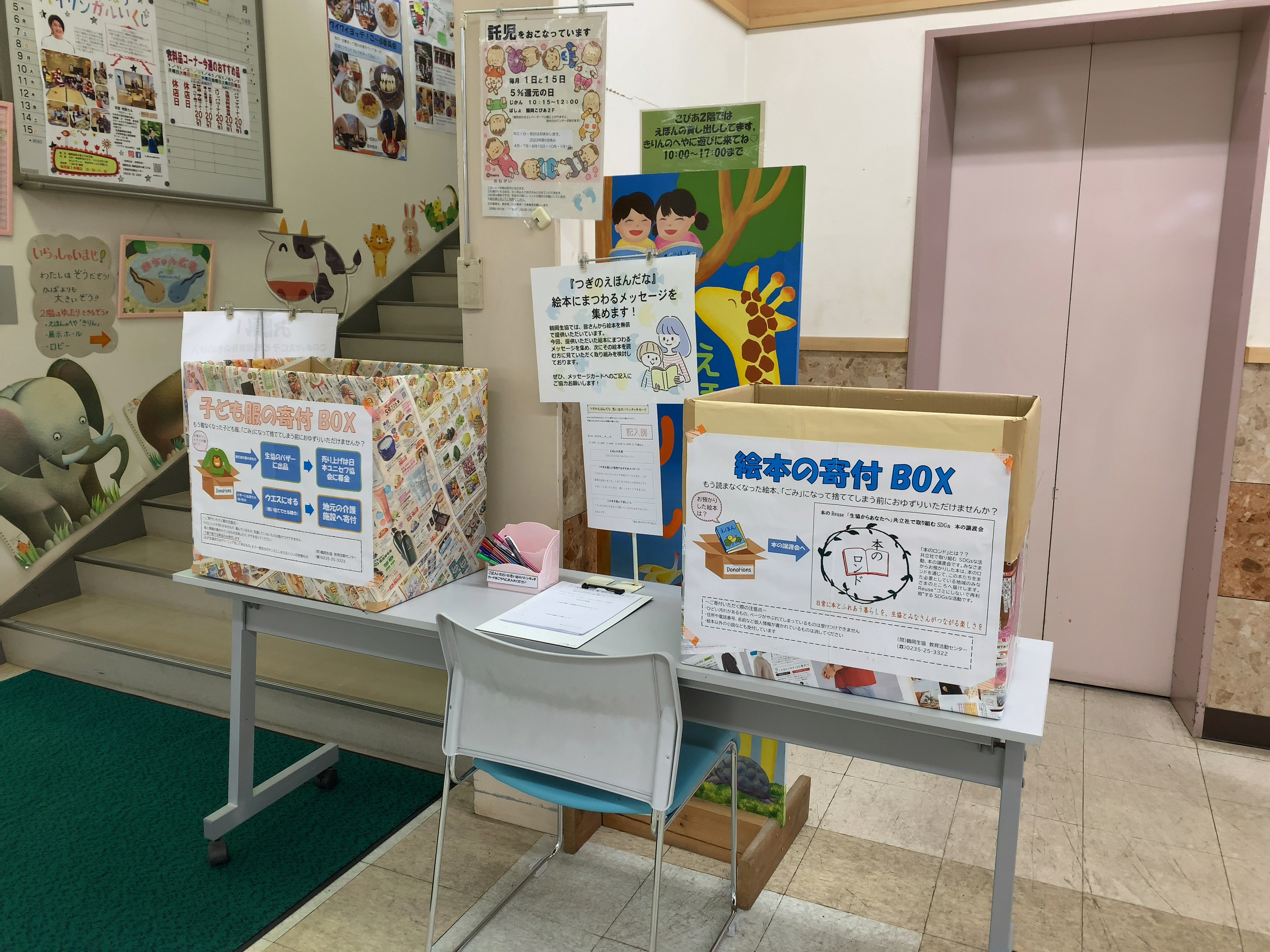 鶴岡協同の家こぴあ2階では、常時絵本の寄付BOXを設置して