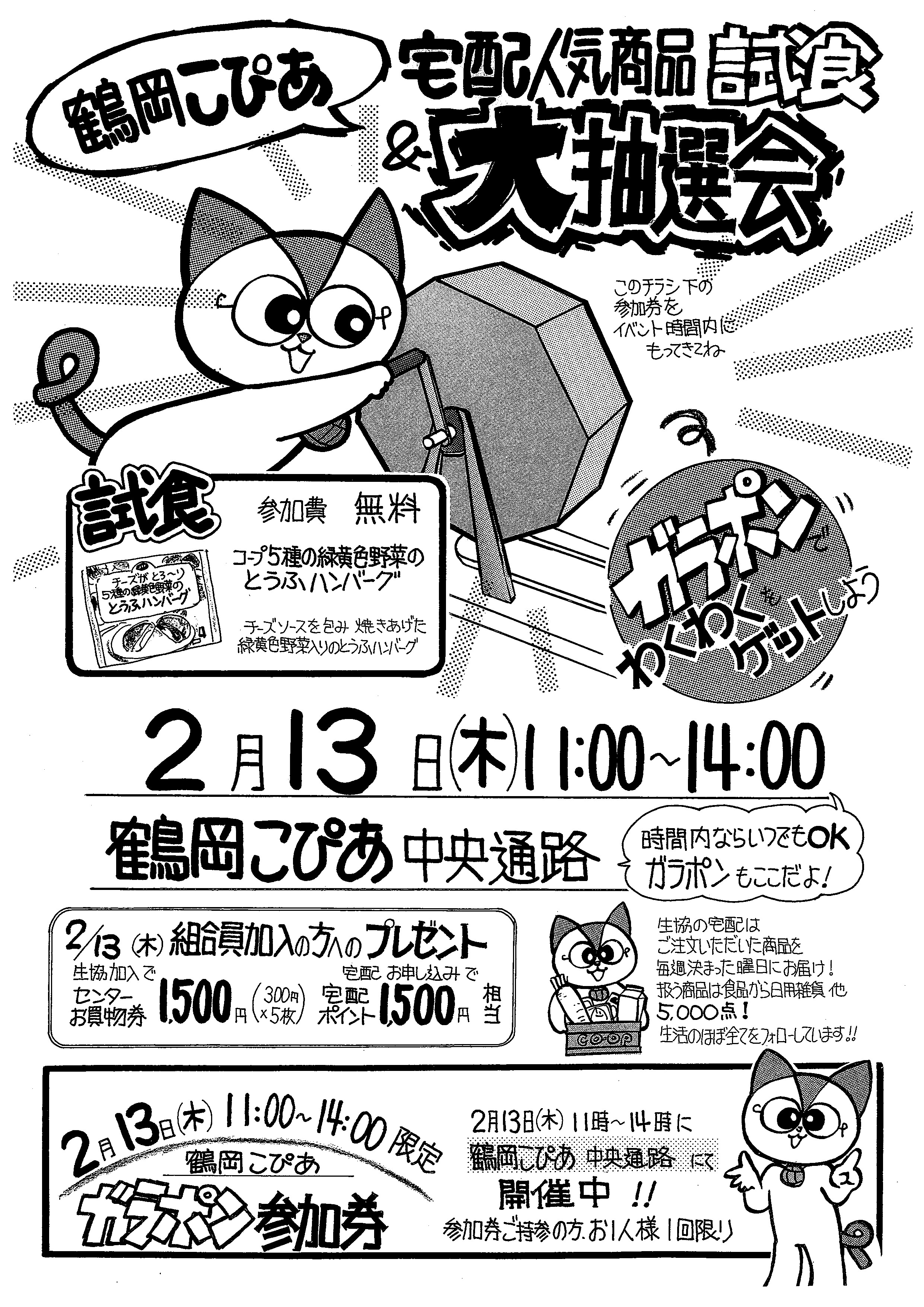 2月13日(木) 11:00~14:00 鶴岡こぴあ中央通路 にて生協宅配で取り扱いの人気商品の試食会と大抽選会、COOP共済の保証の相談会を実施します。ぜひ、この機会にお立ち寄りください。