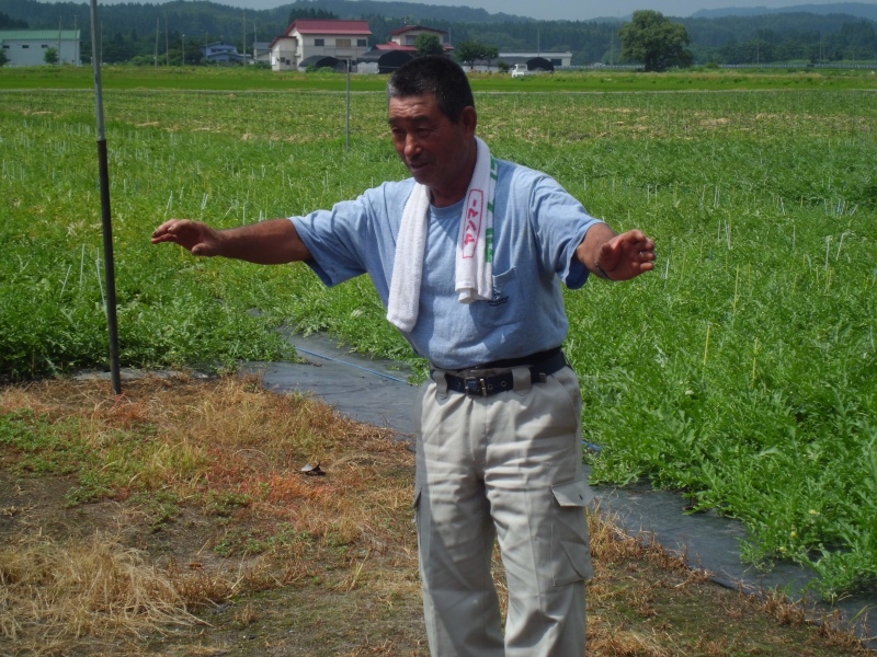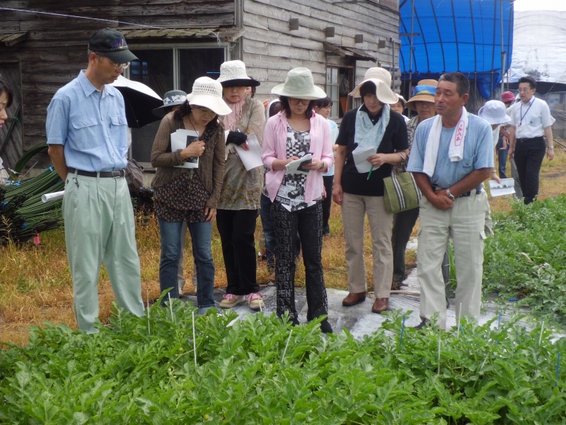 早速小玉スイカの畑を見学。あまりなじみがない、「種なし」スイカをその場で切って、試食に。種がないと参加者から拍手が。「種なし」スイカは介護施設や保育園でのデザートに喜ばれ、作ろうと思ったそうです。小玉スイカの「姫甘泉」とあわせて全員で試食しました。来年ぐらいには提供できればとお話が。甘い、おいしい、みなさん自然と笑顔に。さらに「紅まくら」というスイカも見学しました。これはラグビーボールのような楕円形になるスイカです。そのとなりにもなぞの黒いスイカが。組合員を代表して山形の廣部さんより「おいしいすいかをご馳走になりました。この評判がこれからさらに注文に結びつくと思います。お体を大切に頑張ってください。来年もぜひ交流させてください。」とあいさつ。