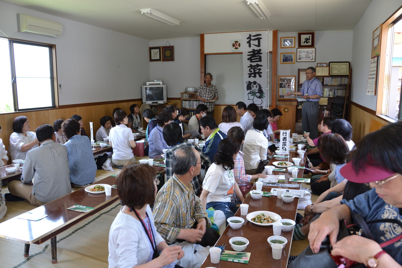 交流会会場に戻り準備していただいた行者菜のスープと横澤さんの在来野菜の花作(はなつくり)大根を使った特別な五色スタミナ漬けをいただきました。さっぱりとしておいしかったです。朝行者菜を収穫し冷蔵庫に入れて翌日共同購入に届き、セットして3日目に皆さんのところに配達されます。にらと違ってとても日持ちがよいのも特徴です。ひなた村の行者菜は私たちだけでなくいろんな方にご協力いただいてここまで来ることができました。今長井市挙げて応援してもらっていますし、たとえばこの山伏風のキャラクターは芸工大の学生さんが作ってくれたもので、それまではただ袋に入れてただけでにらだと思われていましたがこれをつけてから売れるようになりました。(笑) 料理についてはレシピ集なども作りましたが料理の方法も含め皆さんにもいろいろアイディアを出していただけたらとお話がありました。 最後に地元を代表して伊藤さんより、自身の行者菜体験もまじえ、今日の交流会の様子もお知らせして行者菜を普及していきたいと長井市のPRもかねたご挨拶をいただき閉会しました。