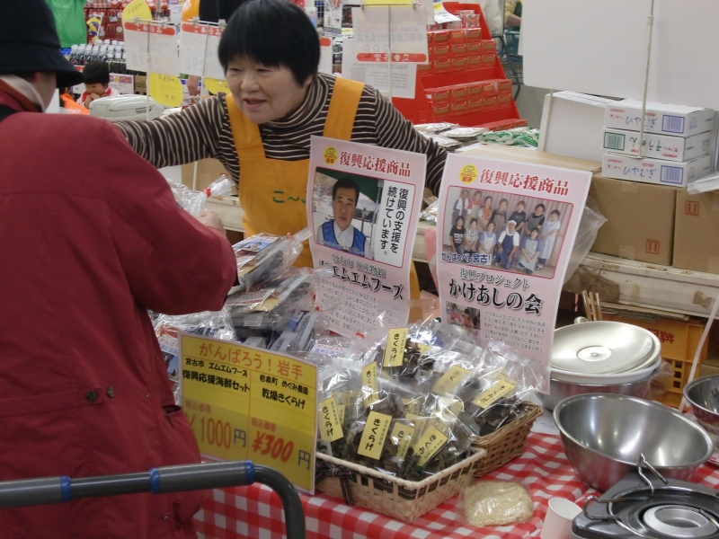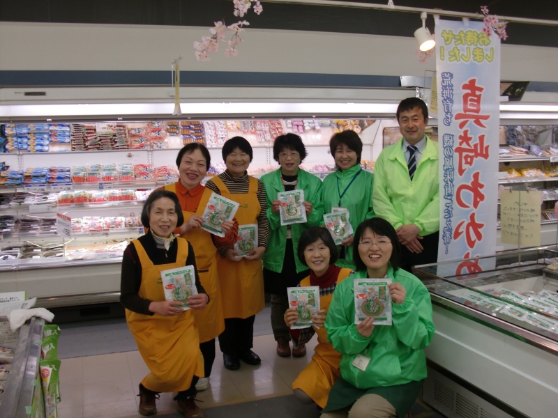 この日は、収穫加工に多忙な毎日を送られている田老漁協から鳥居工場長に遠路かけつけていただき、組合員さん、職員といっしょに試食も出しながら「真崎わかめ」の復活をアピール。