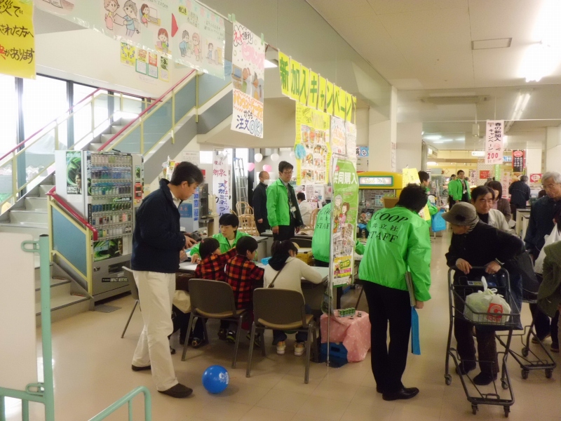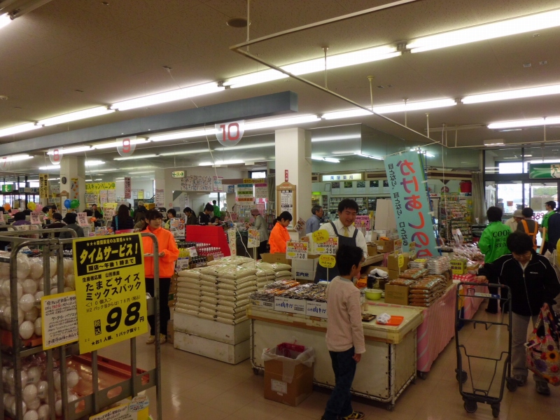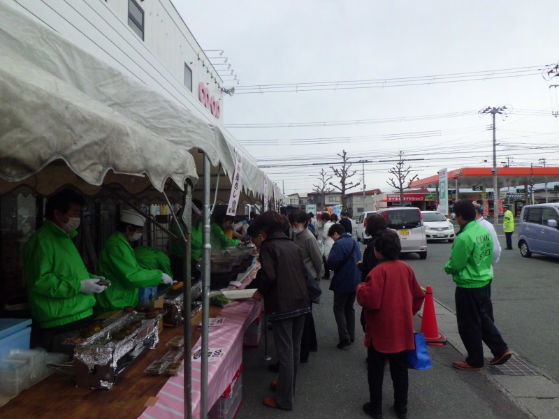 先週酒田の春祭りではいっしょに販売した同じ岩手の復興支援グループ「かけあいしの会」のみなさんは、この日は沖縄に向かったので、その商品を預かって、販売。話題の塩サイダーや、海産物の詰め合わせなど買い求める方が多くいらっしゃいました。また一緒に地産地消をすすめる県内の生産者取引先さんに多数ご協力いただき、お祭価格で自慢の商品を試食提供頂きました。テントでは、庄内の孟宗汁、山形牛の串焼き、庄内浜の鮮魚や加工品が販売され、冬の寒鱈汁がうまかったのでまたきたよ、私も庄内人だから春はやっぱり孟宗汁と会話も弾みます。今回はコープのさばの味噌煮など共同購入の人気冷凍食品も試食販売されほぼ完売、にぎやかに加入推進活動も行なわれ、当日7名の方が新しく組合員に。