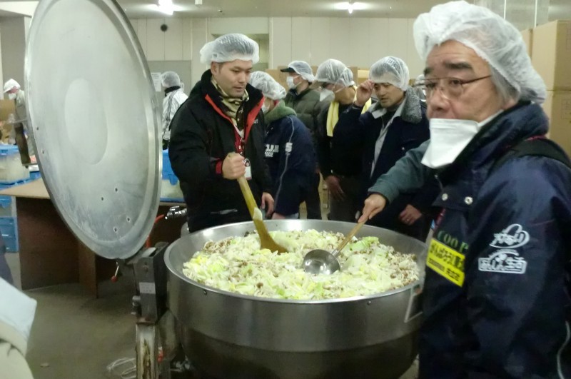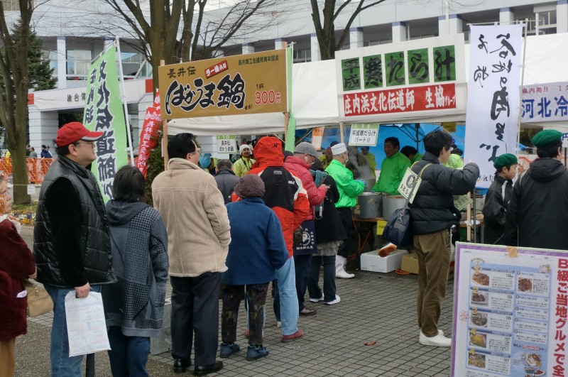 その下の写真は昨年12月に天童市で行なわれた平成鍋合戦に「平成寒だら汁」で庄内浜文化伝道師生協グループとして参戦したとき の模様です。この日は用意した500杯があっという間に完売しました。