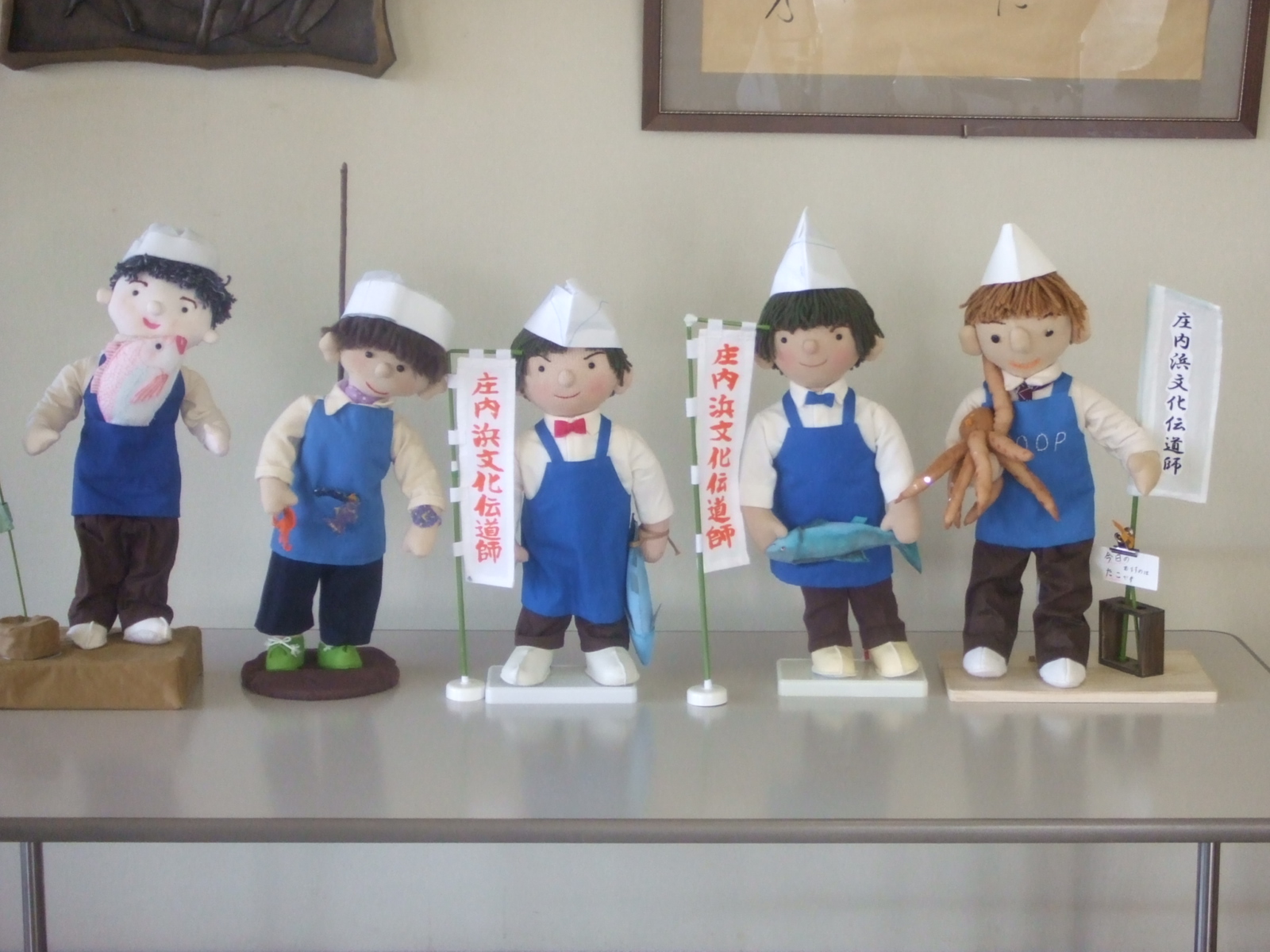 *下の大きい写真は生協組合員が共立社職員の庄内浜文化伝道師をイメージして作ったかわいい人形たちです。
